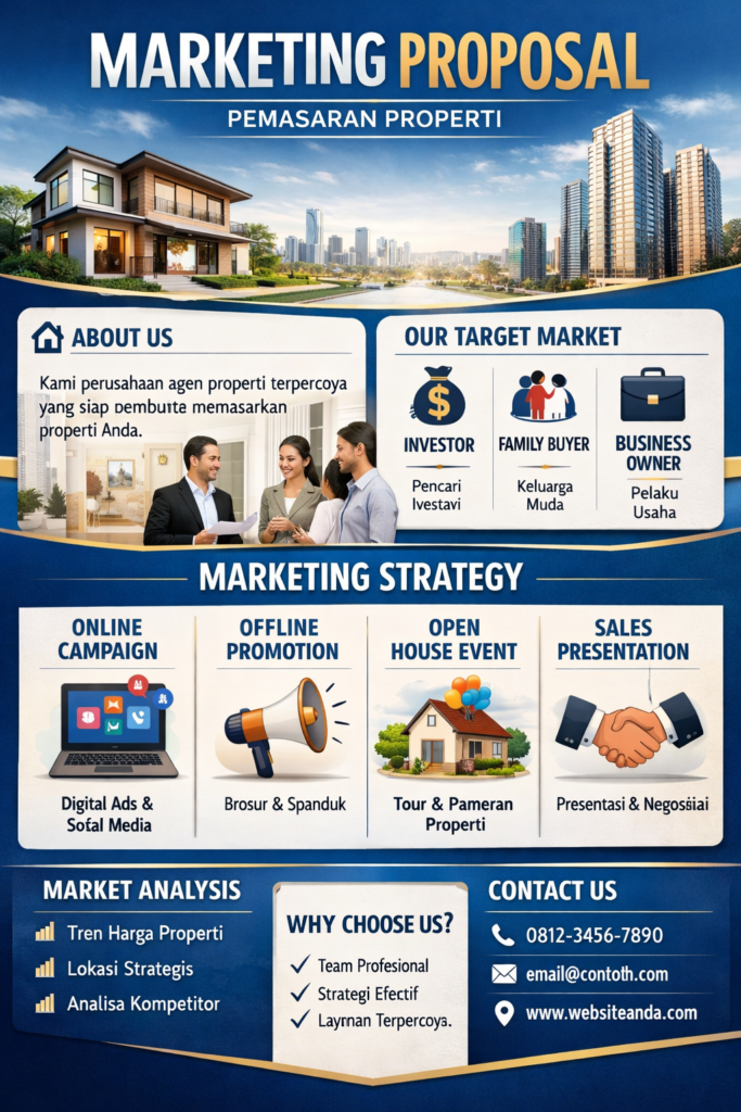Marketing proposal adalah dokumen pemasaran properti yang biasanya dibawa oleh agen atau sales properti saat melakukan presentasi listing kepada calon vendor. Sayangnya, hanya sekitar 1–3% agen yang benar-benar membawa marketing proposal saat presentasi, padahal dokumen ini memiliki peran penting dalam meningkatkan kredibilitas dan peluang mendapatkan listing.